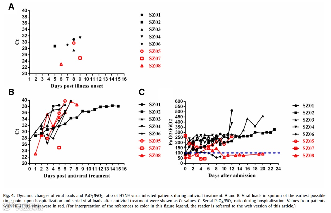 H7N9患者入院后有严重肺部疾病,并具有ARDS疾病的特征。两组患者PaO2/FiO2动态模式相似,说明两种病毒引起的疾病严重程度相似。