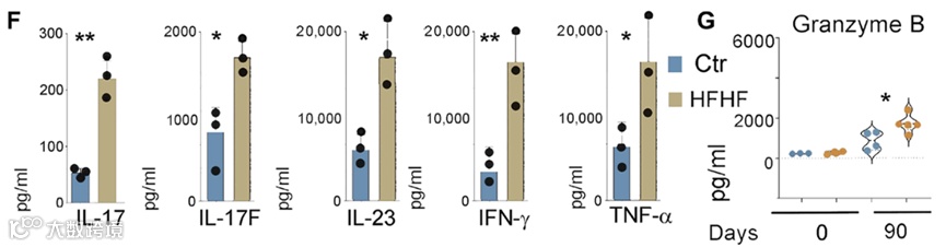 使用QAM-TH17-1分析对照和HFHF饮食小鼠的总肝细胞裂解液中是否含有炎症细胞因子。与对照组相比,HFHF喂养小鼠的pdia3反应细胞分泌的GZMB和多种炎症细胞因子(包括IL-17、IL-23、TNF和IFN-y)的量增加,表明HFHF喂养小鼠的肝脏中存在pdia3特异性T细胞,即使在没有免疫的情况下,对其同源PDIA3肽的增殖也会向功能性TH1和TH17型分化,并释放促炎细胞因子和细胞毒性分子。