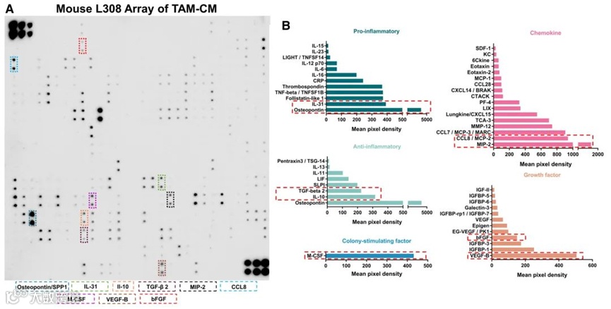 本项研究向我们展示了新型巨噬细胞TAMEMs用于糖尿病伤口愈合的制备,通过细胞及体内实验验证了TAMEMs在小鼠糖尿病伤口中发挥的关键修复活性,包括调节炎症,刺激血管生成和促进增殖。其中利用RayBio 能同时半定量检测308种细胞因子的膜芯片(AAM-BLM-1)一次性地对TAMs – CM中的因子含量进行了检测,快速地锁定了重组蛋白培养基中关键蛋白的含量。