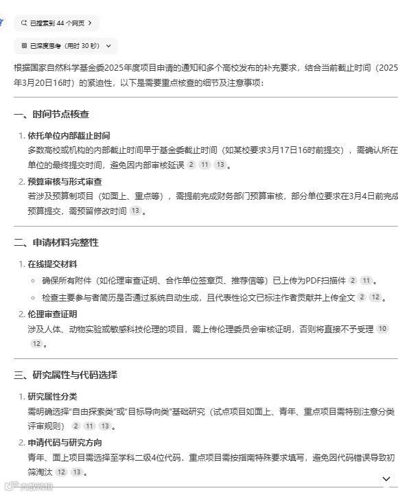 还是那句话——关于DeepSeek,已经被全网轰炸两个月了,真的不想再多说一个字!我们更关心的是它能为我们带来哪些实际价值,尤其是在工作和科研领域,是否能助力我们实现质的飞跃。国自然备战已进入最后10天倒计时(3月20日16时平台提交截止),很多科研单位可能划线更早。为了达到更好的呈现结果,就一起再忍吐问问Deepseek,当然,时下宣称“遥遥领先”的AI工具还有很多,随便找个你认为靠谱的也行,看看能不能在最后时刻补补缺……