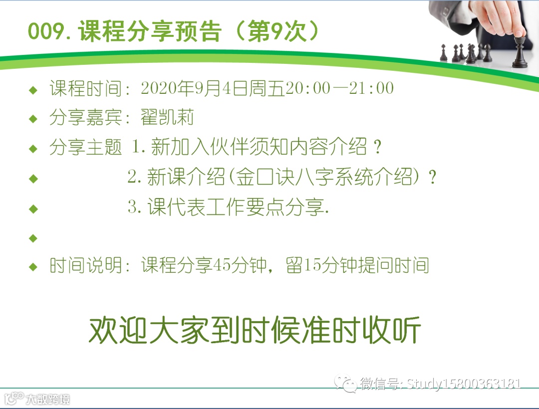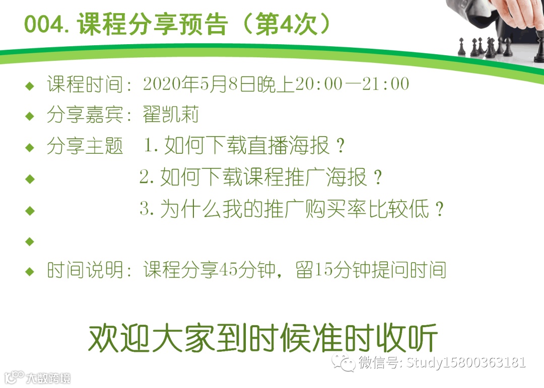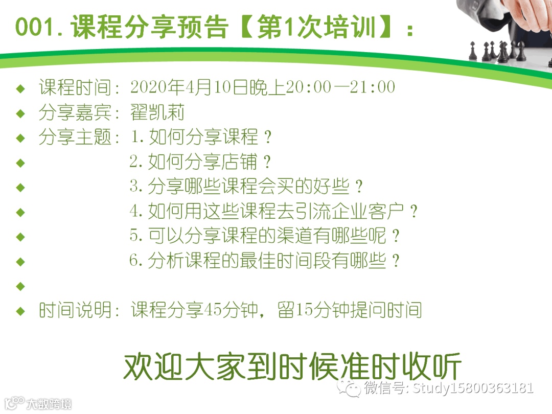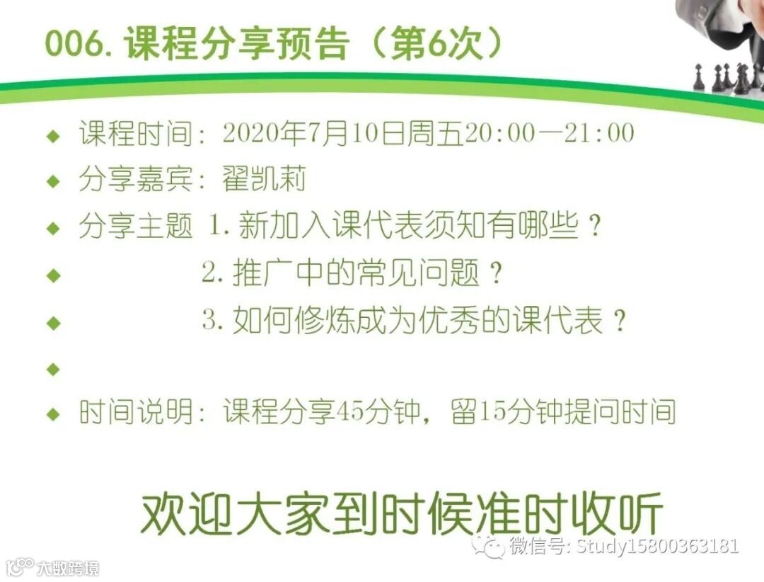 热爱教育培训行业,对培训行业有着高度热情,直接扫描海报二维码申请即可.提供全方位的免费培训,欢迎申请. 课代表伙伴有问题交流微信信群,每个月有1-2次培训,以下是第1-9次的培训内容,新加入的伙伴可以回听.