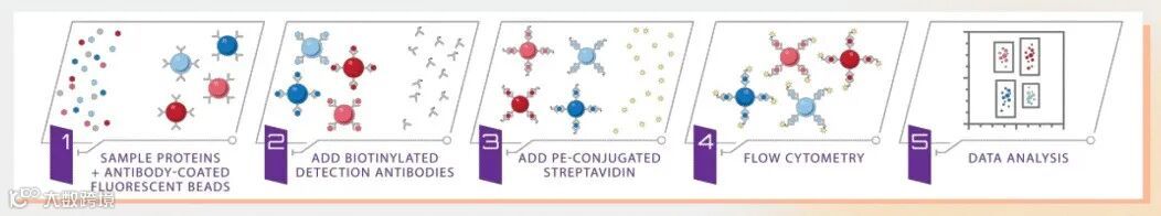 利用双抗夹心免疫分析原理,通过使用微珠大小和荧光团的不同组合,可以同时分析多个目标蛋白,拥有APC及PE通道的标准流式细胞仪即可使用!