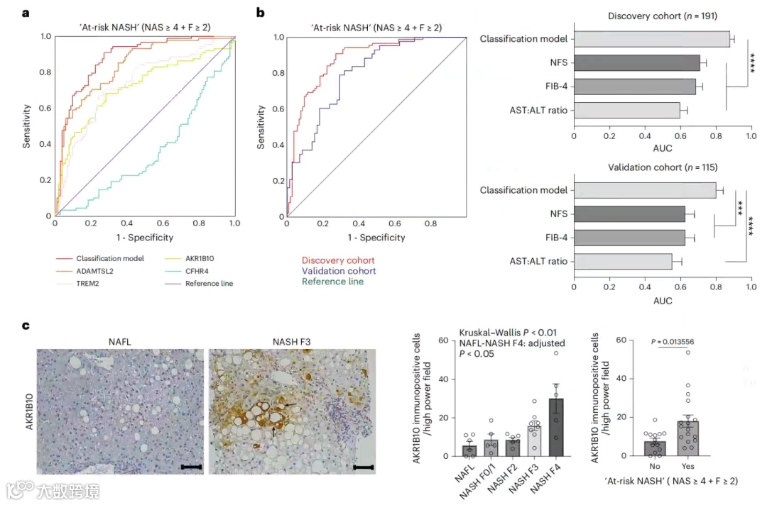 在发现队列上将特定循环蛋白(如ADAMTSL2、AKR1B10、CFHR4和TREM2)和临床因素(如BMI、2型糖尿病状态)纳入逻辑回归模型,然后使用115例独立的血清样本对上述逻辑回归模型进行验证,评估模型的诊断性能与泛化性(此处使用血清而非血浆,因此结果对比时需慎重理解两种样本类型之间的潜在差异)。