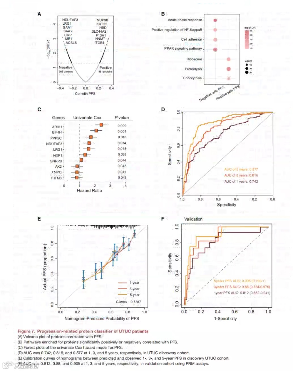 通过在独立验证队列中使用PRM等靶向定量技术对筛选出的蛋白面板进行检验,可进一步确认标志物组合的稳健性与临床应用。最终获得一系列能区分UTUC患者与健康对照、以及区分非肌层浸润型(NMI-UTUC)与肌层浸润型(MI-UTUC)的标志物,建立由多个蛋白构成的“进展时钟”用于预测患者的无进展生存期。