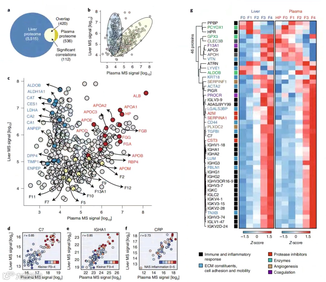 研究在191例经组织学表征的NAFLD患者中进行血浆蛋白组分析,其中52例患者有配对的肝脏活检组织。接下来通过皮尔森相关分析,将血浆中4730种循环蛋白的表达量与同一患者的肝脏转录组(RNA-seq数据)进行关联分析,从中筛选出与肝脏转录特征显著相关的蛋白标志物。