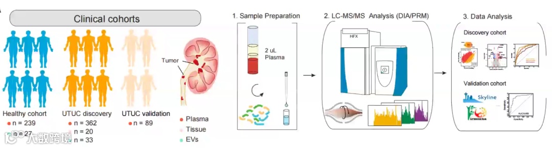 将多种生物样本(血浆、组织、尿液、血浆外泌体)进行蛋白质组学分析,通过与健康对照以及不同病理分期样本的比较,利用统计和机器学习方法对差异蛋白进行筛选和模型构建,并在独立验证队列和PRM定量分析中进一步验证标志物与模型的稳定性和实用性。