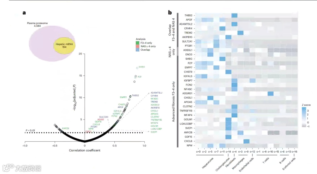获取31个既与纤维化进展(F3-4)又与较高疾病活动度(NAS≥4)相关的显著蛋白-转录分子(见下图a)。接下来利用独立的公共单细胞RNA测序数据集(并非本研究患者来源的数据)(见下图b),以此确认这些蛋白主要由何种肝脏细胞类型产生(例如肝细胞、胆管细胞、巨噬细胞、成纤维细胞等)。