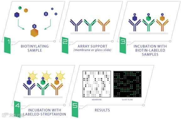 通过简单的标记过程,样品蛋白质直接与生物素结合,无需第二抗体来产生阵列信号。在这种形式中,抗体间没有相互影响,因此消除了对芯片尺寸的限制,理论上是可以无限扩增检测数量。
