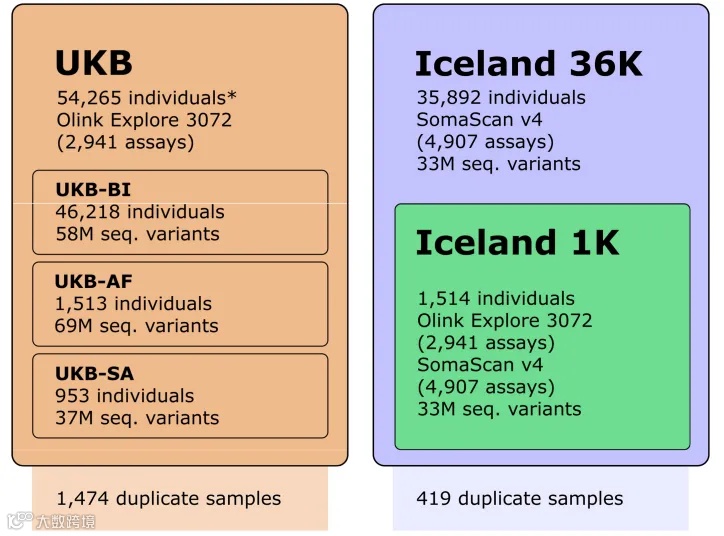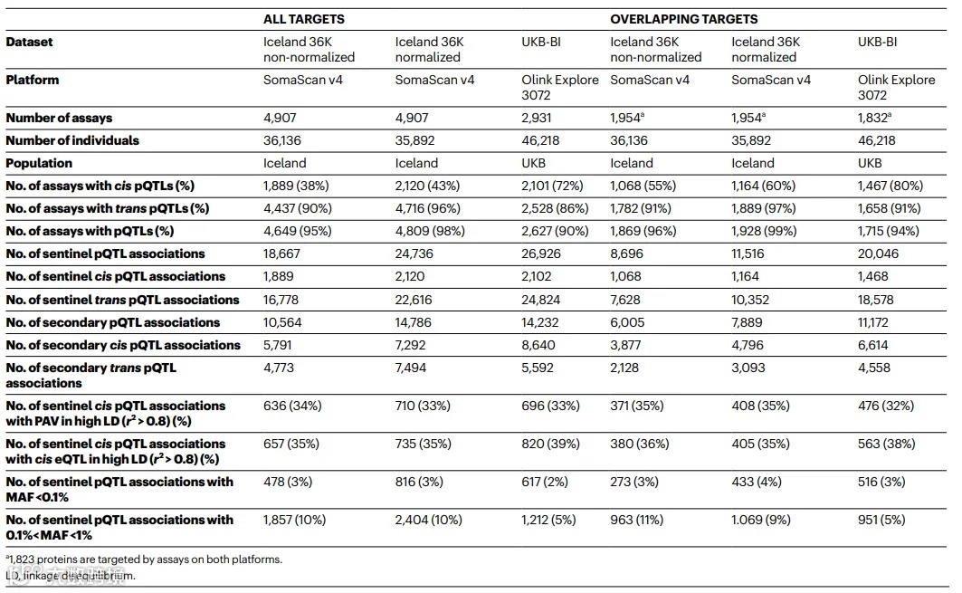 高通量蛋白质组学平台能够测量血浆中数千种蛋白质,将结果结合基因组和疾病表型信息,可以弥补基因组与疾病间的差距。deCODE团队的研究人员对UKB-PPP项目中5万多人样本,包括46,218 个英国或爱尔兰血统个体(UKB-BI)、953 个南亚血统个体(UKB-SA)和 1,513 个非洲血统个体的血浆样本,通过 Olink Explore 3072 血浆蛋白组学平台进行了2,931种蛋白的关联研究,并将研究结果与 36,000 名冰岛人的SomaScan v4血浆蛋白组(4,719种蛋白)研究结果进行了比较,其中 1,514 人也有Olink 数据。