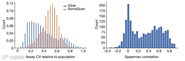 单独检测的蛋白质水平(左:重复性对比;右:两个平台的相关性)