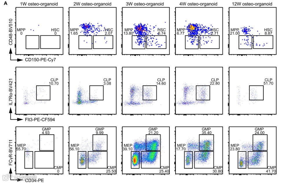 类骨器官细胞总数在纤维增殖和骨软骨分化阶段迅速增加,随后在植入后第3周的骨髓生成阶段保持稳定(图A),并发现类骨器官比天然BM含有更多的免疫组分(图B)。