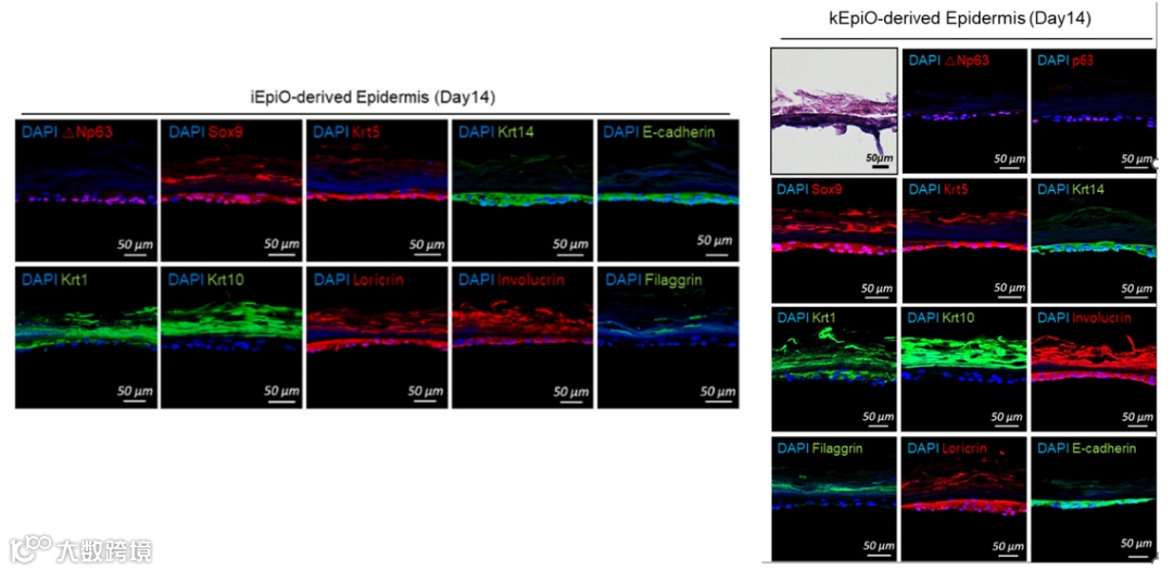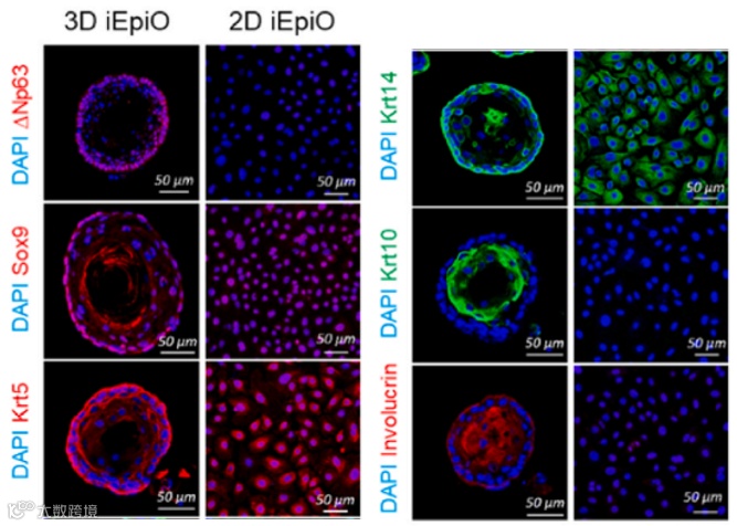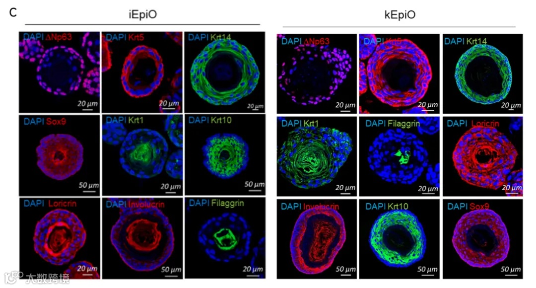 表皮细胞生成的类器官的标志物(基底层标记物(△Np63、Sox9、Krt5和Krt14)、棘层标记物(Krt1和Krt10)、颗粒层标记物(Loricrin和Involucrin)和角化层标记物(聚丝蛋白))做免疫荧光对比(图C),发现来自ipsc的分化表皮类器官表现出表皮形态,具有角质化的上皮,具有基状、棘状、颗粒状和角质化的角质细胞室。