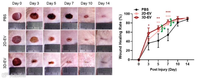 注射3D - ev的小鼠相对2D-ev在伤口形成之日起的第3、5和7天,伤口愈合速度平均提高了1.6倍。结果表示3D - ev在可以加快伤口创面减小速度。