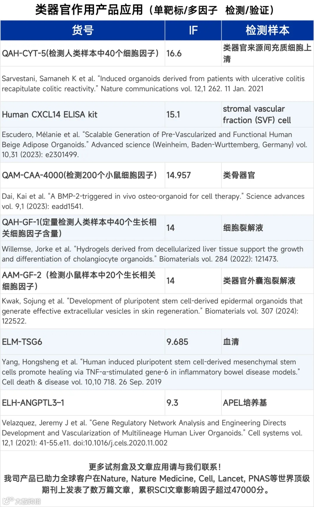 由于类器官结果及成分的特殊性,在研究中往往不可缺少对类器官、类器官分泌物、类器官发育环境进行蛋白质检测及验证,RayBio具有多款单靶标/多靶标检测验证试剂盒,可适用于多种研究目的,包括类器官建立中的蛋白图谱绘制,研究中期对类器官及其分泌物的细胞因子研究、功能对比,后期验证等环节。