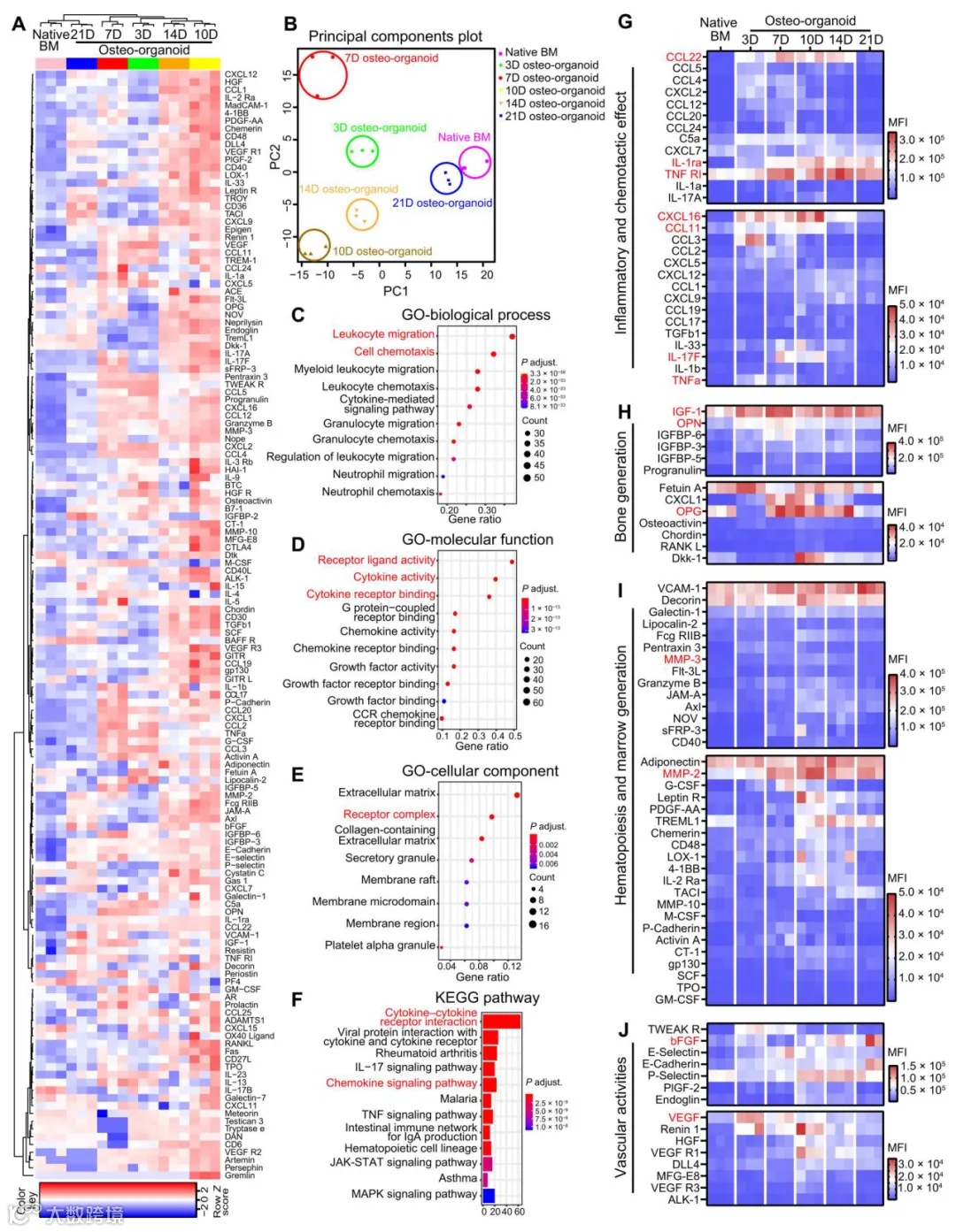 为了探究类骨器官的分子表达与功能间的关系,利用可以检测200个因子的抗体芯片分别对3, 7,10, 14, 21 的类骨器官进行检测,获取蛋白图谱,发现植入类骨器官21天后其蛋白图谱与天然BM中最相似,这也解释了其可稳定产生HSPCs和免疫细胞。