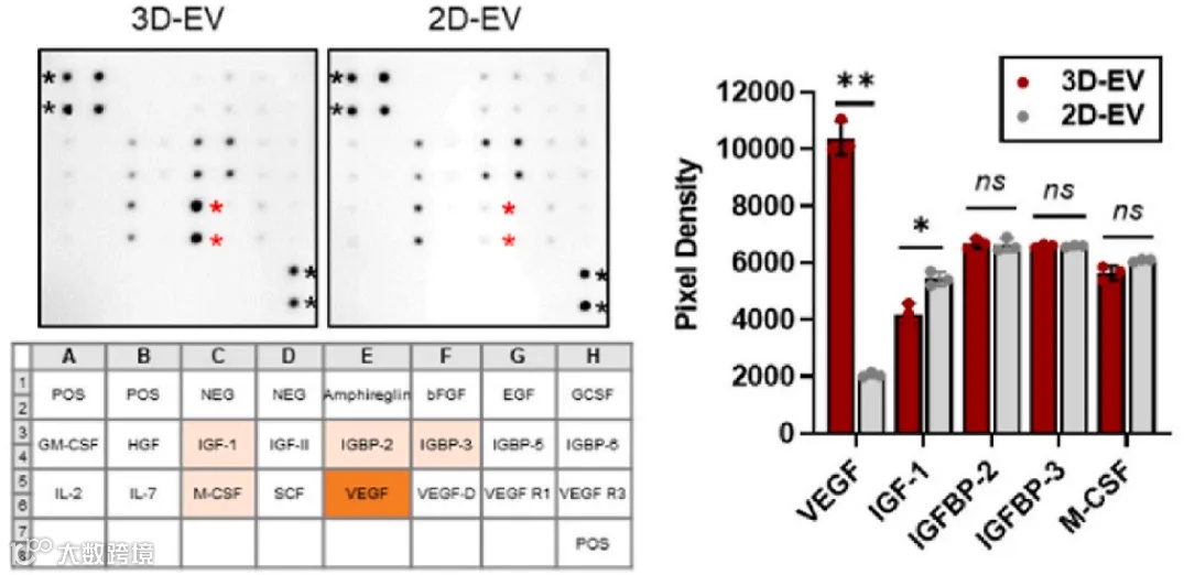 研究简介:本文研究利用多能干细胞(iPSCs)诱导产生了表皮类器官(EpiOs),并进行3D培养后提取了其中的细胞外囊泡(EVs),抗体芯片检测及RNA-seq检测发现,3D培养的EpiOs产生的血管生成因子、细胞迁移、细胞增殖相关因子都含量丰富,有利于诱导组织再生,结合小鼠体内创面愈合实验也证实了其功能。结论表示,3D-EpiOs的EVs有成为加快体内伤口愈合的新技术。