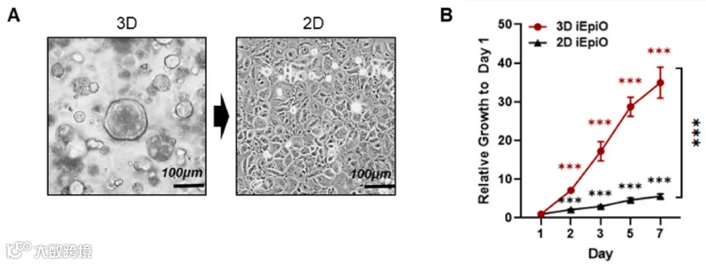 对比2D、3D EpiOs的培养,发现3D培养环境下细胞表型、生长量及标志物表达量都优于2D培养的EpiOs。