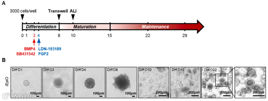 实验室改良诱导条件后(A图),诱导多能干细胞(iPSCs)产生的表皮类器官(EpiOs)作为一种新型表皮,并观察表型(B图)。将本研究产生的类器官及传统小鼠原代(kEpiO)