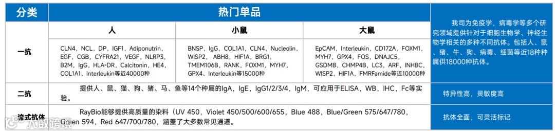 针对类器官的研究,同时需要做大量的WB、ELISA、流式细胞、IF、IHC等免疫学验证,RayBio作为全世界抗体储备的最大的抗体库,含有上万种动物、病毒蛋白靶标抗体,支持各个学科类器官研究中蛋白免疫学的验证,具体靶标欢迎咨询!
