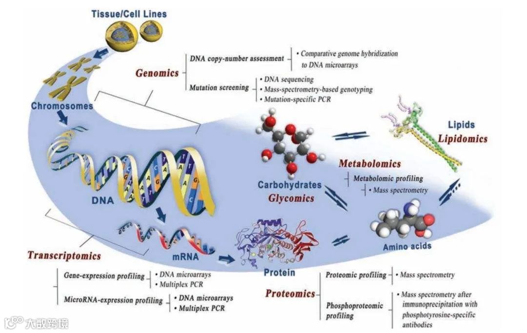 基于基因组学、转录组学、蛋白组学、代谢组学、宏基因组等不同组学信息,进行联合分析,从而更全面、深入地研究生物进程和疾病过程中复杂机理和遗传基础。
