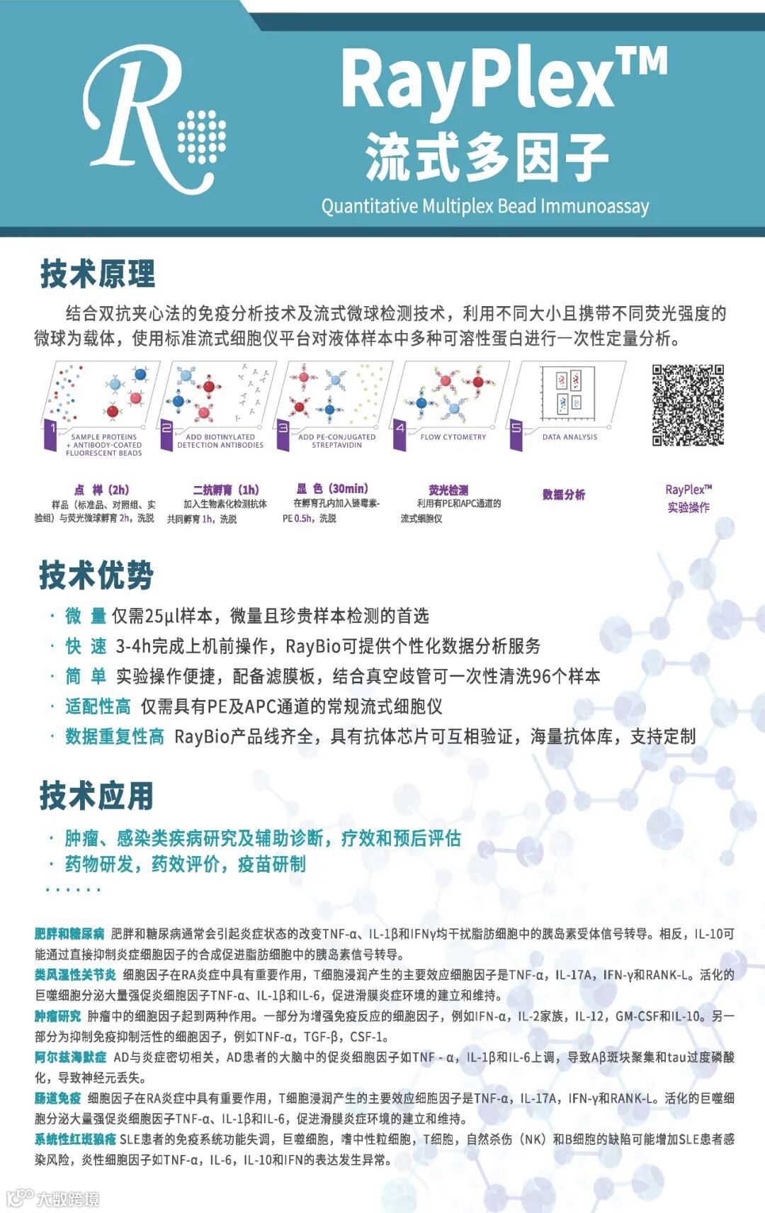 利用双抗夹心免疫分析原理,检测时将靶蛋白固定在微球上的捕获抗体和荧光偶联的检测抗体之间。通过使用微球大小和荧光强度的不同组合,可以同时定量分析多个靶标蛋白。目前已拥有多个物种、不同方向共计上百个panel可选。
