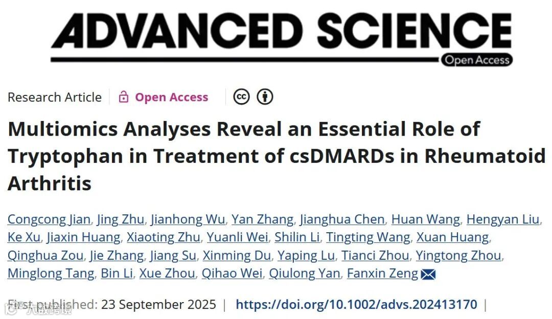 英文题目:Multiomics Analyses Reveal an Essential Role of Tryptophan in Treatment of csDMARDs in Rheumatoid Arthritis