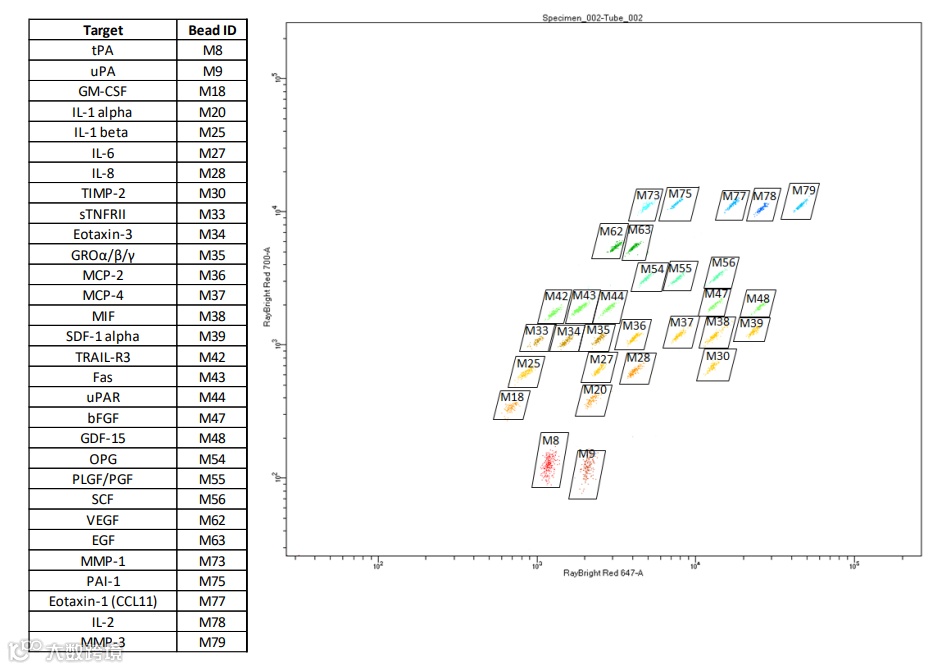 利用双抗夹心免疫分析原理,检测时将靶蛋白固定在微球上的捕获抗体和荧光偶联的检测抗体之间。RayPlex®多重微球通过使用微球大小和荧光强度的不同组合,可以同时定量分析多靶蛋白。