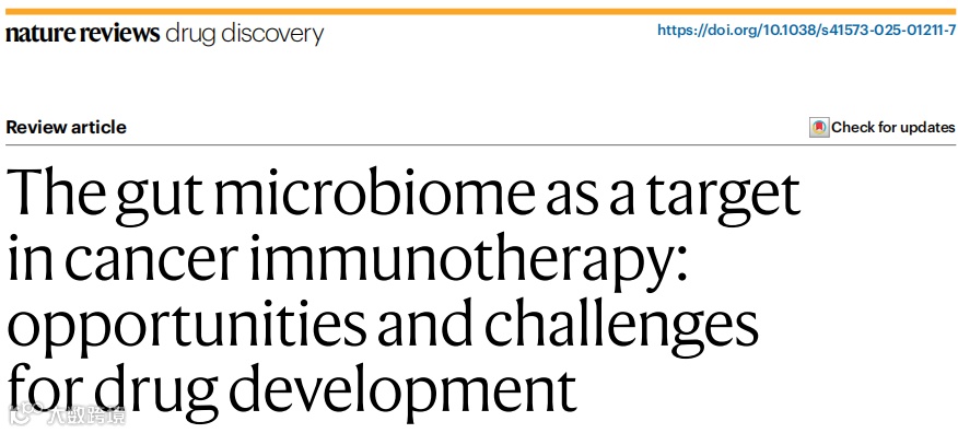 在现代医学持续探索癌症治疗优化路径的征程中,肠道微生物组逐渐从幕后走向台前,成为备受瞩目的焦点。传统的癌症治疗手段,如化疗、放疗虽能在一定程度上抑制肿瘤,但伴随的副作用常常给患者带来沉重负担;免疫疗法虽为部分患者带来曙光,却面临有效率有限、适用癌症类型局限的困境。越来越多的研究揭示出肠道微生物组与肿瘤治疗间存在着一定的联系。从调节机体免疫力,助力抑制肿瘤细胞的增殖与侵袭,到改善治疗耐受性、减轻不良反应,肠道微生物组展现出巨大的治疗潜能。基于微生物组的疗法不仅为理解癌症治疗应答差异提供了新视角,更推动了粪菌移植、益生菌干预、饮食调节等基于微生物组的治疗策略研发。今天一起解读一篇最新综述文章,题为:“The gut microbiome as a target in cancer immunotherapy: opportunities and challenges for drug development”,此篇文章发表在期刊《Nature Reviews Drug Discovery》上,全面探讨了肠道微生物组在癌症免疫治疗中的作用,分析了当前的研究进展和临床试验结果,并讨论了将肠道微生物组调节策略应用于临床实践时面临的挑战和未来的发展方向。