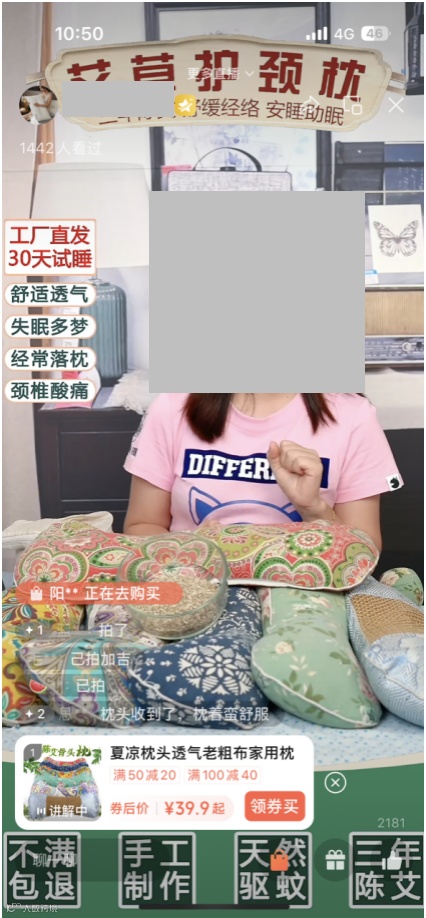 左部:工厂直发/30天试睡等直播间特点+针对人群(失眠多梦、落枕、颈椎酸痛等)
