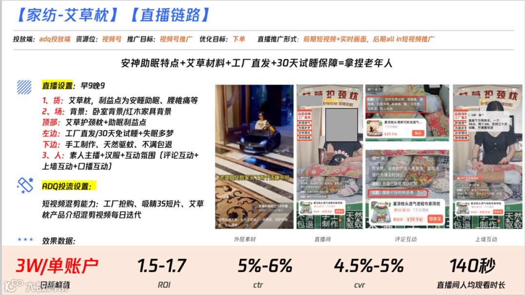 很多商家想要了解:ADQ投放视频号直播的具体效果和SOP,平台以家居行业的艾草枕举了个例子,以供参考: