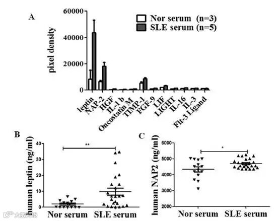 为了研究SLE血清中引起MSCs衰老的因子,选用Raybiotech AAH-CYT-G5 检测80个人细胞因子的抗体芯片对5个SLS患者血清以及3个正常人血清进行检测,其中SLE血清中有12个蛋白比正常人血清表达量高且有显著性差异,其中差异最大的是leptin和NAP-2,为了验证该差异蛋白,选取24个SLE与12个正常血清进行ELISA验证,验证结果与抗体芯片结果相符。