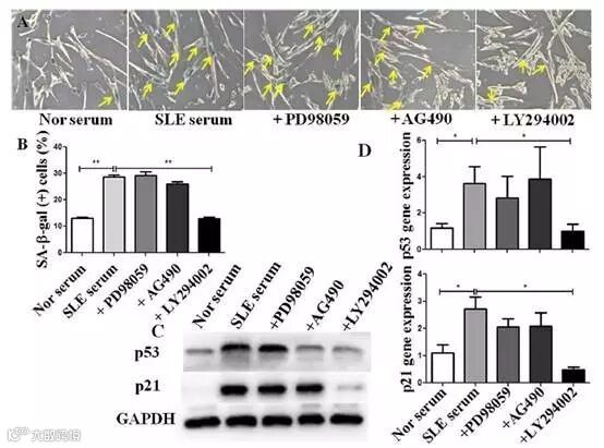 JAK/STAT,Ras/Raf/MEK/ERK,NF-kB以及PI3K/AKT信号通路都被汇报与细胞衰老有关,而本研究中WB结果表明STAT-1,STAT-5,Akt,MEK,ERK-1/2的磷酸化水平都在用SLE患者血清处理后表达量上升,但STAT-3,Ras以及NF-KB的磷酸化水平却没有改变,结果表明本研究中与细胞衰老相关的通路可能为JAK/(STAT-1 and STAT-5),MEK/ERK或PI3K/Akt。为了明确具体涉及的信号通路,接下来用MEK/ERK抑制剂PD98059,JAK/STAT抑制剂AG490,以及PI3K/AKT抑制剂LY294002在用SLE患者血清处理前分别处理细胞。结果表明LY294002处理后SA β-gal阳性表达细胞数量减少,p53/p21 mRNA及蛋白表达水平下降,而用PD98059及AG490处理的细胞则没有明显变化,进一步说明SLE血清引起的MSCs衰老是通过PI3K/AKT信号通路进行的。