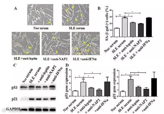为了验证leptin及NAP-2蛋白在SLE患者血清中的作用,实验中加入leptin和NAP-2的中和性抗体到SLE患者血清培养的的UC-MSCs。结果表明不管是加入leptin或者是NAP-2的中和性抗体后SLE血清引起的UC-MSCs衰老现象减少,SA β-gal阳性细胞数量及p53/p21的mRNA及蛋白表达水平都显著下调。