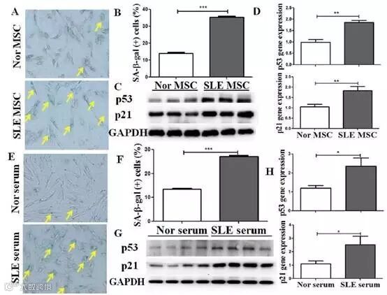 为了检验SLE患者中分离的MSCs的衰老状态,检测了SA β-gal及p53\p21表达水平。结果表明SLE患者中的SA β-gal表达量比正常对照组明显升高。SLE患者的MSCs P53\p21的mRNA及蛋白水平都比正常对照组高,证明SLE患者的MSCs衰老水平比正常人高。脐带分离的MSCs(UC-MSCs)在功能及表象上与正常人MSCs相似,选取其SLE患者血清微环境研究对象。用正常人血清与SLE患者血清,分别对UC-MSCs进行培养,结果表明用SLE患者血清培养的MSCs其的SA β-gal表达量、P53\p21的mRNA及蛋白水平都比正常人血清培养的对照组高,结果表明SLE血清能够在体外促进MSCs衰老,且在SLE病人中MSCs衰老中起关键作用。