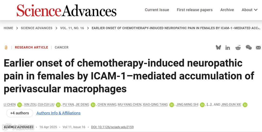 中山大学团队在顶级期刊《Science Advances》发表重磅研究,首次揭示女性患者在硼替佐米化疗后更早出现神经痛的免疫机制——脊髓血管中的"巨噬细胞暴动"竟是关键!