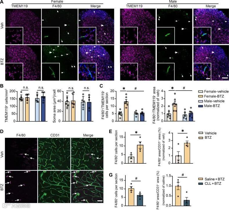 雌性小鼠在BTZ治疗后第3天,脊髓血管周围F4/80+巨噬细胞数量显著增加,而雄性小鼠未见明显变化(图3A-E)。
