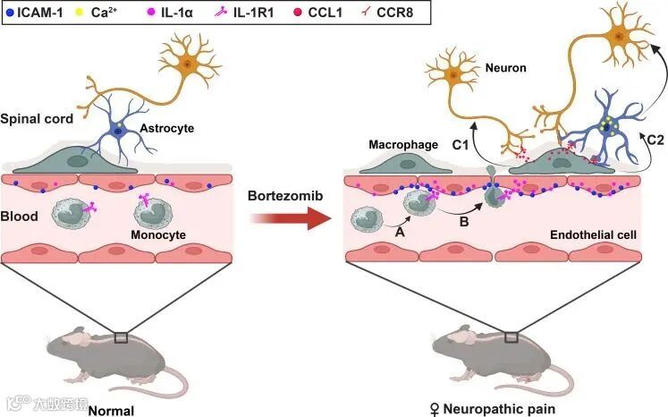 化疗诱导的神经病理性疼痛(CINP)是癌症治疗中常见的副作用,严重影响患者的生活质量和治疗依从性。本研究通过回顾性临床分析和动物模型,探讨了硼替佐米(BTZ)治疗多发性骨髓瘤(MM)患者中女性比男性更早出现神经病理性疼痛的机制。研究发现,女性患者在BTZ治疗后较早出现感觉障碍,这与脊髓血管周围巨噬细胞的积累及其释放的CCL1介导的神经元超兴奋性有关。