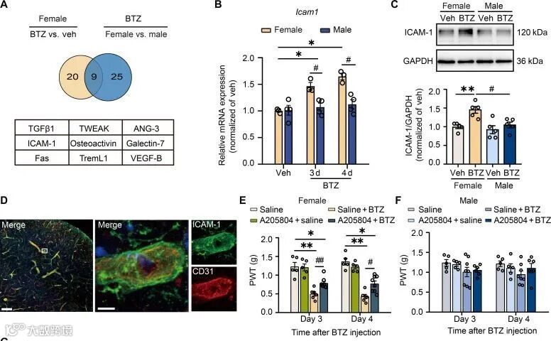 BTZ治疗后,雌性小鼠脊髓血管内皮细胞中ICAM-1和IL-1α的表达显著上调(图4B、C)。