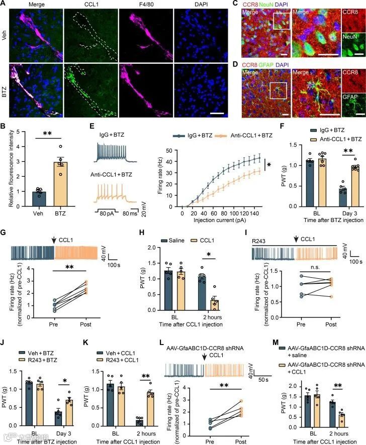 浸润的巨噬细胞释放CCL1,通过CCR8受体直接激活神经元或通过星形胶质细胞间接增强神经元兴奋性(图7A-K)。