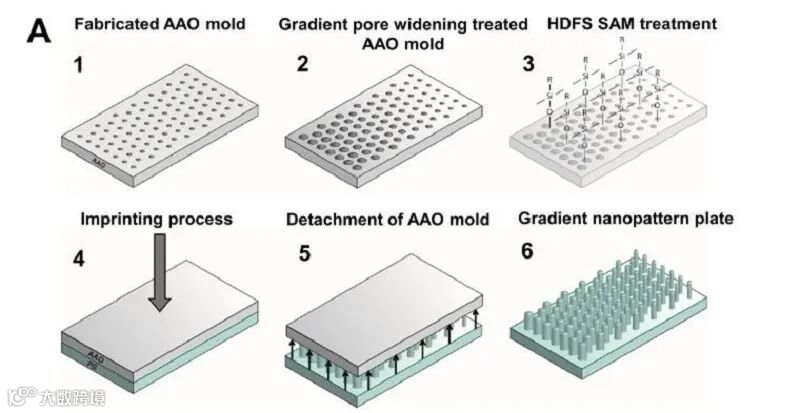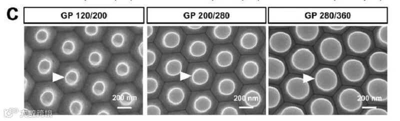 受到血管内皮表面各向异性的纳米形貌的启发,研究人员制作了梯度纳米柱板。采用阳极氧化铝(anodic aluminum oxide,AAO),梯度蚀刻,形成梯度纳米孔模具(规则六边形纳米孔阵列,直径在120和440纳米)。通过1H,1H,2H,2H-全氟癸基三氯硅烷(heptadecafluoro-1,1,2,2-tetrahydrodecyl trichlorosilane ,HDFS)自组装单层膜处理。AAO模具压印聚苯乙烯基板,形成一层不同直径的纳米柱(2A)。根据纳米柱薄膜的直径范围,特定为纳米GP 120/200, GP200/280, 和 GP 280/360。SEM电镜成像分析,展现连续性纳米柱模型(箭头指向纳米柱)(2C)