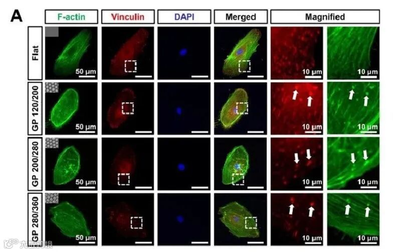 3、梯度纳米柱板培养的hECFCs中黏着斑蛋白和F-肌动蛋白结构的调节