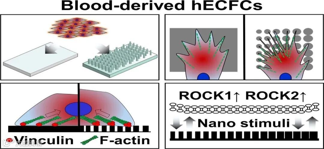 在本研究中,研究人员精确模拟了梯度纳米形貌。实验结果说明了hECFCs是一种对梯度纳米柱板灵敏的细胞。进一步,这些结果表明,纳米形貌可能诱导与这些蛋白(外周血衍生hECFCs的ROCK)表达相关的mRNA改变。这些梯度纳米板的特性在细胞工程上的应用有很大的希望,并可应用于其他受纳米形貌刺激的自体细胞生物学中。