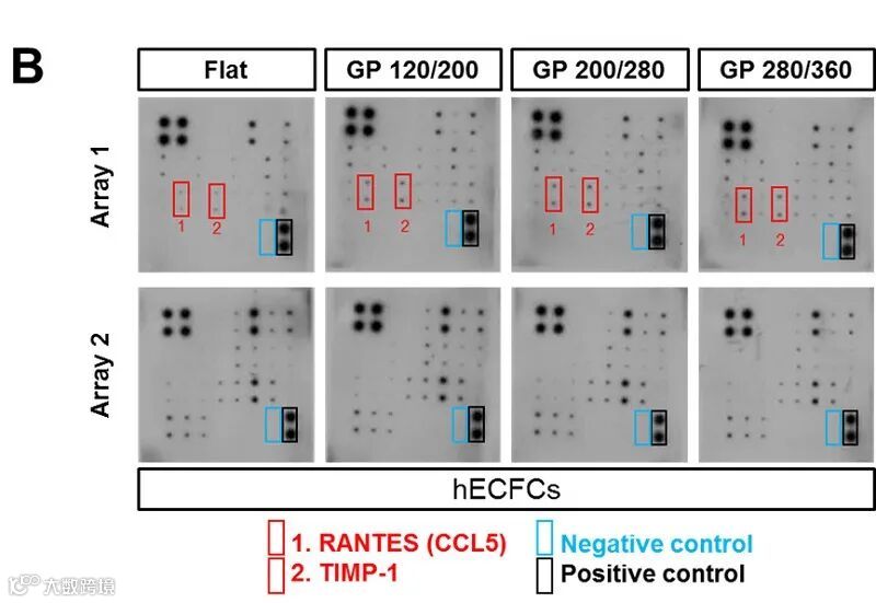 此外,通过血管生成因子蛋白芯片(RayBiotech Human Angiogenesis Array C1000)检测,在GP 120/200,GP200/280,和GP 280/360中培养的hECFCs中,RANTES和TIMP-1蛋白表达水平上调(S 6B)。这些发现表明,梯度纳米柱板有望改善HCFCs血管生成潜能。