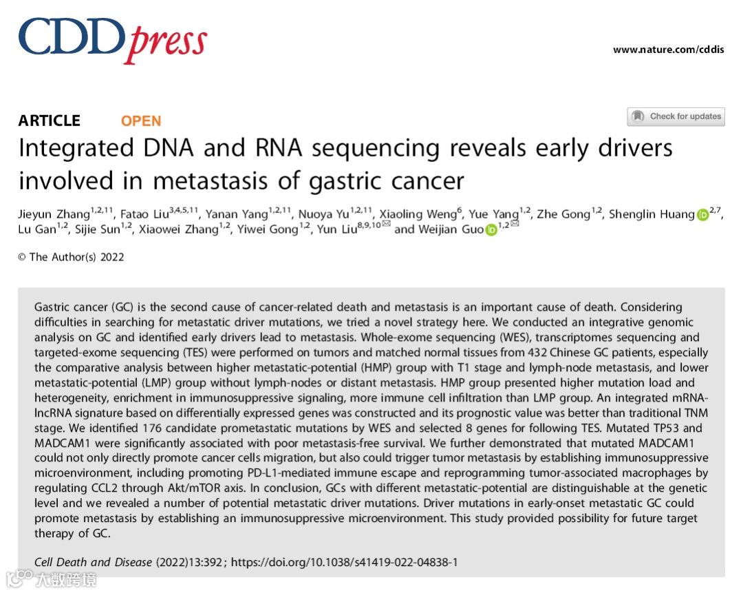 Jieyun Zhang, Fatao Liu, Yanan Yang, Nuoya Yu, Xiaoling Weng, Yue Yang, Zhe Gong, Shenglin Huang, Lu Gan, Sijie Sun, Xiaowei Zhang, Yiwei Gong, Yun Liu, Weijian Guo. Integrated DNA and RNA sequencing reveals early drivers involved in metastasis of gastric cancer. Cell Death and Disease (2022) 13:392 ; https://doi.org/10.1038/s41419-022-04838-1