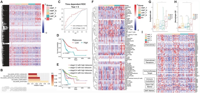 为了进一步阐明在RNA水平上研究转移潜能和基因表达之间的关系,研究团队对87例GC患者的肿瘤和配对正常组织的转录组进行了分析。结果显示基因集富集分析(GSEA)基因标记在HMP肿瘤和HMP正常组织中富集,但在LMP肿瘤和LMP正常组织中不富集。此外,在HMP组肿瘤中,内皮细胞和M2巨噬细胞比HMP组正常组织和LMP组肿瘤组织升高(图4G、H)。并发现一些EMT标记物(即SLUG)、干细胞样细胞标记物(即EZH2)、趋化因子(即CCL11、CCL13、CXCL6)、趋化因子受体(即CCR6、CCR7、CCR9、CCR10)、免疫检查点靶点(即CD70、IDO1)和其他免疫调节剂(即TGFB1、VEGFA、VEGFC)显著上调,在HMP肿瘤中有表达,但在LMP组中无表达(图4) 。