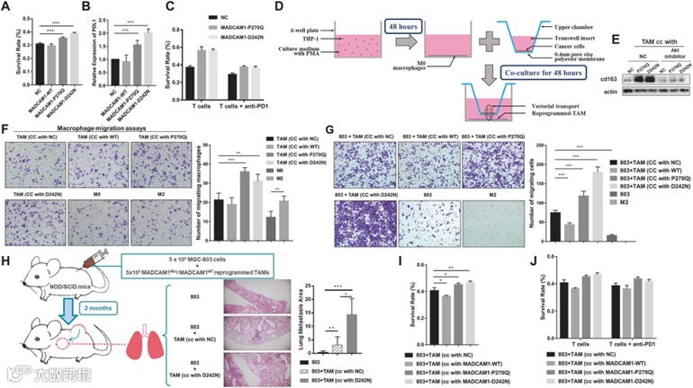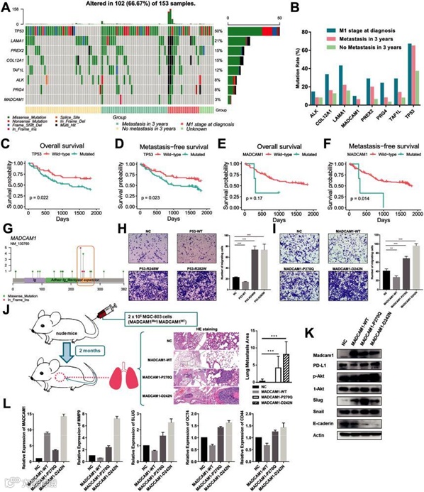 研究团队进一步对另一组153名GC患者进行了TES,使用HMP组中突变率较高的8个候选基因,结果显示MADCAM1和TP53突变促进转移,在术后3年内发生转移的患者中,TP53、MADCAM1、PREX2、PRG4和TAF1L的突变率几乎是无转移患者的两倍或更多,并且TP53和MADCAM1的突变率具有统计学意义(图3B),TP53和MADCAM1热点突变可增强GC细胞的迁移能力(图3H、I)并且在体外实验中证实了MADCAM1及其突变体在GC细胞增殖中的作用。