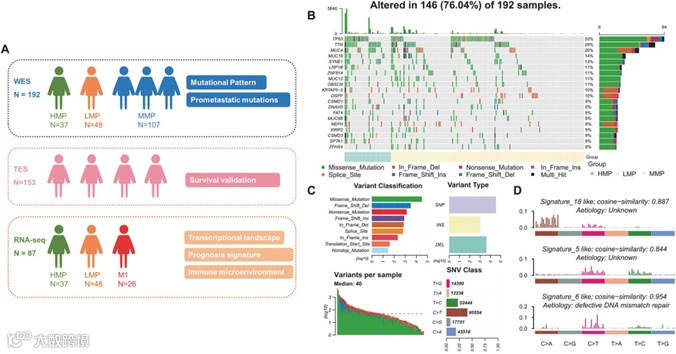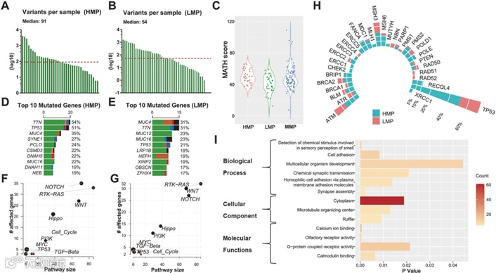 研究团队为了进一步确定潜在的促转移突变基因,将样本分为HMP组(n=37)和 LMP 组(n=48),以及MMP组(T2-4N+M0,n=107) ,结果发现NOTCH和RTK-RAS途径分别在HMP和LMP组中居于首位(图2F、G),其中HMP组有176个基因的突变率显著高于LMP组(>10%(p<0.05),HMP组大多数(24/31)的突变率较高(图2H)。