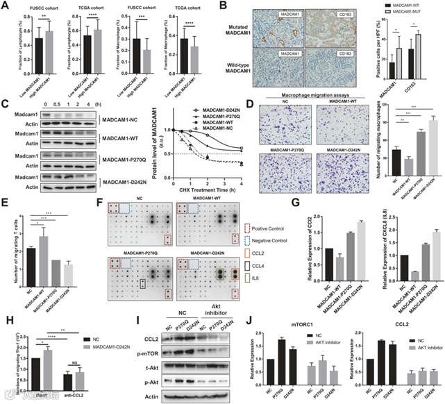 研究团队发现MADCAM1突变体与T细胞和M2巨噬细胞的趋化迁移有关,在TCGA队列和FUSCC队列中,MADCAM1的表达与淋巴细胞比例呈显著正相关,与巨噬细胞比例呈显著负相关(图A),紧接着,研究发现MADCAM1的表达与许多趋化因子、趋化因子受体和免疫调节剂相关。为了鉴定相关的分泌因子,研究团队使用RayBio Chemokine Antibody Array I(趋化因子芯片,RayBiotech, USA)分析了MADCAM1WTGC细胞、MADCAM1D242N GC细胞,结果发现在MADCAM1D242N GC细胞上清液中的CCL2和IL8更高(图5F、G)。此外,阻断CCL2可减少巨噬细胞的迁移,特别是在MADCAM1D242N GC细胞中(图5H)。这表明MADCAM1D242N招募巨噬细胞的能力部分依赖于CCL2。随后,在Western blot分析中发现(图3K),MADCAM1P270Q和MADCAM1D242N-GC细胞的Akt磷酸化水平明显升高,而总水平变化不大。在MADCAM1P270Q和MADCAM1D242N GC细胞中抑制Akt后,p-mTOR和CCL2的表达受到抑制(图5J)。这些结果表明,MADCAM1突变体通过Akt/mTOR轴调节CCL2促进巨噬细胞的募集。