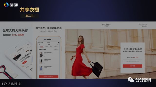 主要案例就是最近比较火的共享单车,共享充电宝,滴滴等生活方式的共享。再举个服装的案例,就是共享衣橱。最近,阿里巴巴花了千万美金投资了这家公司,用户只要每个月支付两百九十九块钱,衣服就可以随便穿。他每次会寄三件衣服,你可以随便穿,如果喜欢还可以把它买下来。共享衣橱的主打概念就是你只要每个月付两百多块钱,你就可以无限制的穿平台中各种衣服,而且有时还会有一些折扣。