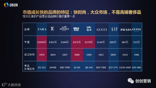 上面给出的是一些服装公司的图,我们发现在这些服装公司当中,快时尚产品价格比较低的企业成立时间并不长,但他们的市值都非常高,这证明了什么?,就是说价钱低于价值的产品,发展会比较快。商业的世界,除了一些创意的竞争,其实大部分都是价值的竞争。比如说小米,相比同价格的一些手机杂牌,他给出了更好的产品,小米现在有很多产品都是这样做的。